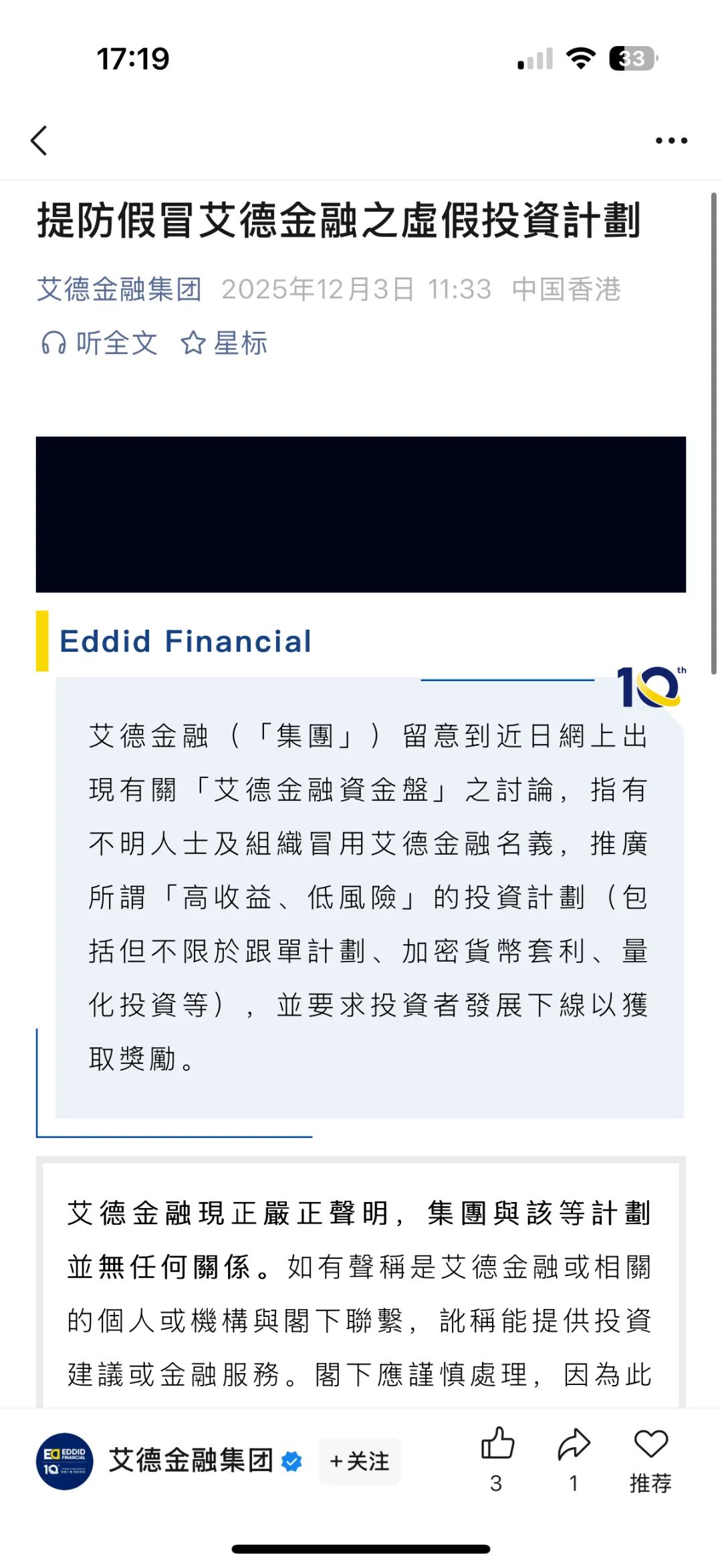 指出真相的人,会变成傻子和骗子的共同敌人,大家好,我是古月,资金盘终究是资金盘,认知能力不够想通过这个方法来赚钱,那是行不通的,有亏钱的才会有赚钱的,切莫幻想,也别抱有侥幸心理。艾德金融EDDID套牌正规公司的资金盘骗局,虚假理财诈骗。不法分子冒充“艾德金融EDDID”的名义,制作散布涉诈APP,虚构推广股票跟单日收益率2%的高额返利项目,充值和提现都是usdt虚拟货币,实施诈骗,正规公司发声明打假,即将收割,速度撤离…