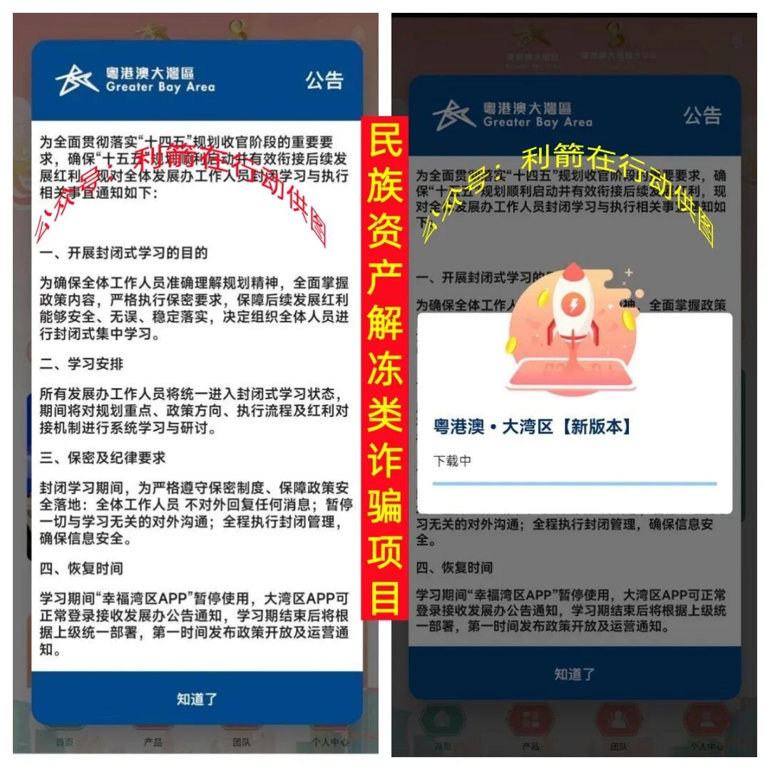 曾经很火爆的”“粤港澳大湾区”APP被有关部门发出打假声明,发出风险提示以后,为了逃避网络舆情,就改名为“共建大湾区”APP,还经常变换网站链接,不管怎么变换名称,这个项目,通过来路不明的个人账户收款,交钱投资的项目随着金额的加大,收益越来越高、周期越拉越长的特点看出是诈骗洗钱的杀猪盘,今年夏天与秋天两次“杀肥猪”(指收了钱不兑现),这段时间该项目发了个所谓的“公告”:…………“组织全体人员进行封闭式集中学习………..”还要参与者保密,暂停“幸福湾区”APP,大湾区APP正常登录接收通知…………