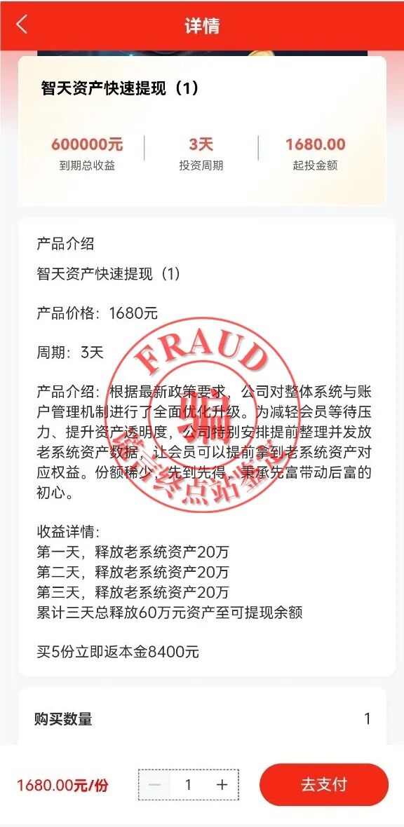 2025年12月13日,推出声称立即返本超高收益的产品。而且一次性购买五份,立即到账,三天后拿60万!