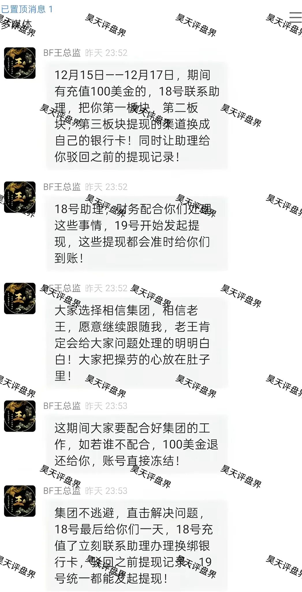 这个盘之前昊天也是预警了几次了,每个月都会单割一部分会员,前天操盘手发布公告宣布彻底崩盘跑路了,理由如下,目前维权中…