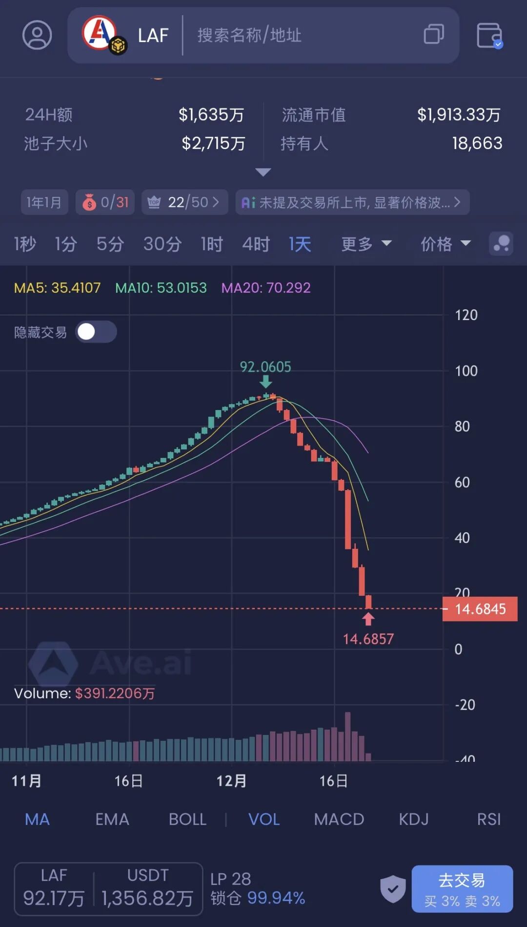 最近这几天年近年关,也是项目周期最难熬的阶段,就拿大家耳熟能详项目,拉菲LAF短短几天的时间从市值1.19亿美金,跌至1截止目前1898万市值,资金底池更是大量出逃6000多w。