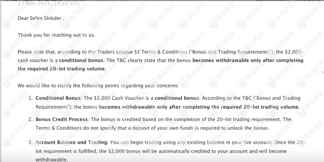 近期,斑马投诉平台接到用户反馈,称其在参与Ultima Markets平台交易大赛后,对奖励发放情况存有疑问。