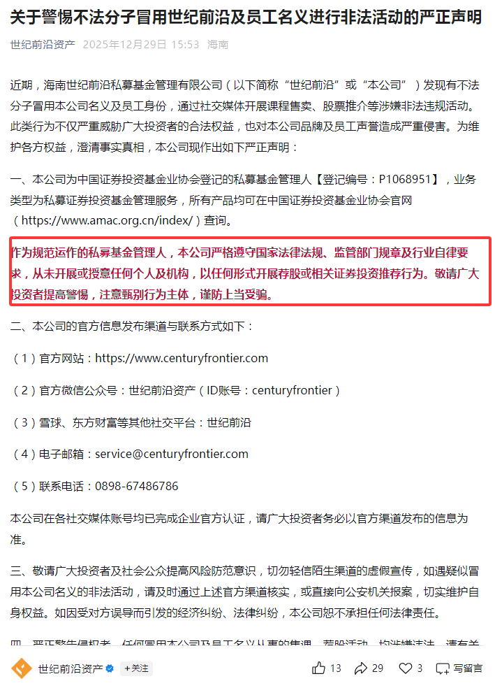 为什么敢说得这么肯定?因为正主——正规持牌的“海南世纪前沿私募基金管理有限公司”——早就坐不住了,直接发布官方打假声明:“我们没开发过这个APP!所有打着我们旗号搞高息理财的,全是骗子!”