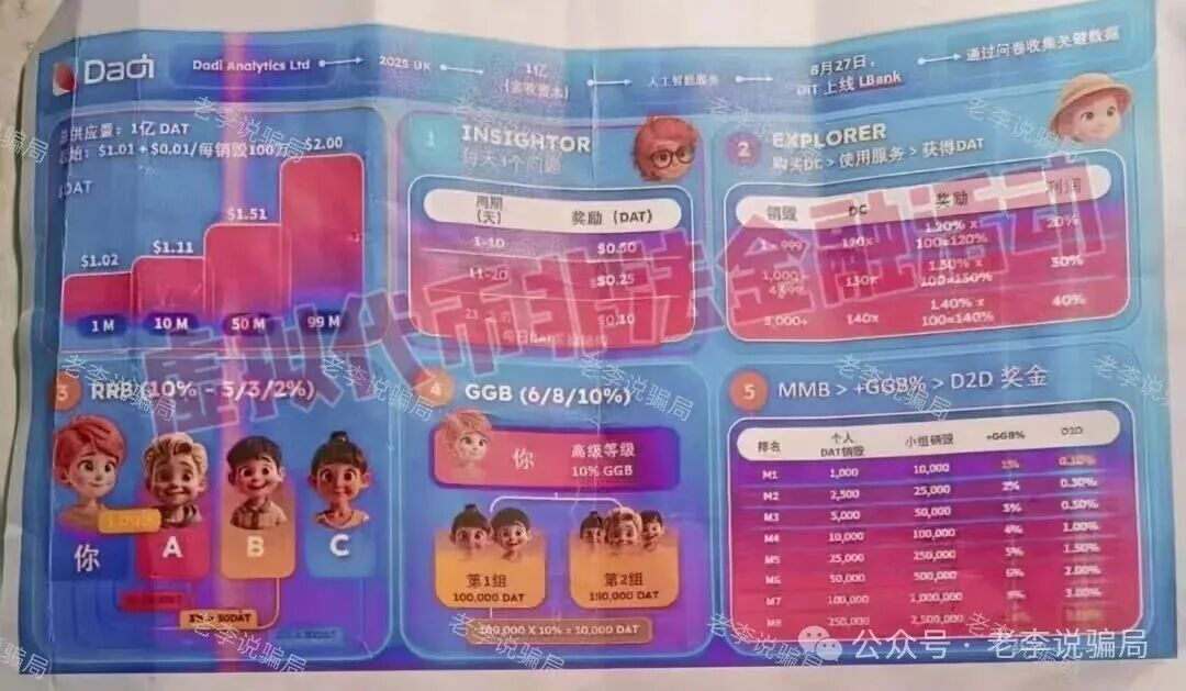打着“人工智能服务”“DAT代币增值”的旗号,设计了一套包含答题领代币、销毁DC兑奖励、层级团队返利(RRB/GGB)、销毁量排名分奖金的复杂模式。
