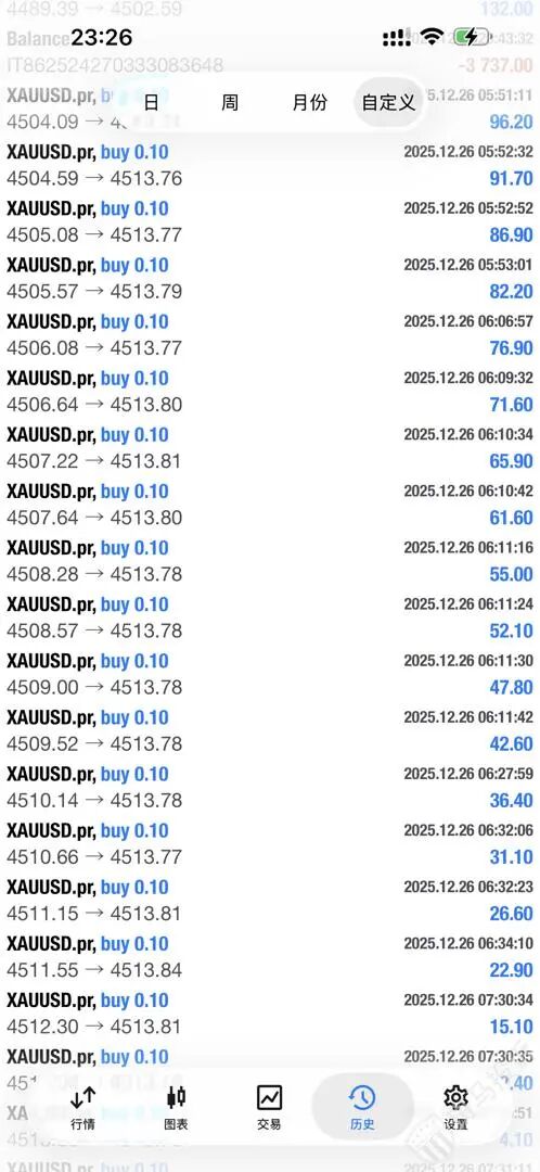 对此,A某解释称,其订单大部分持仓时间在10分钟以上,且多为0.1手的小单,平仓时使用了“一键平仓”功能,因此产生了密集的平仓记录。A某展示的交易策略是:黄金每涨0.1美元加仓一次,导致一个账户出现多个小单子。