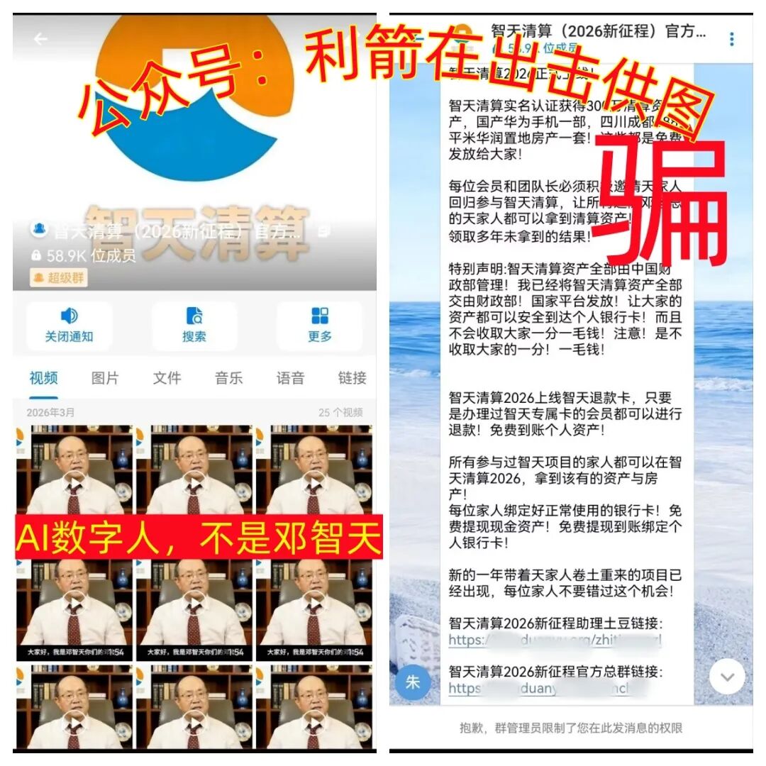 智天清算APP中假冒邓智天的AI数字人谎称智天清算是“国家项目”,通过来路不明的个人账户收款,是诈骗洗钱的虚假项目,目前正在诈骗。