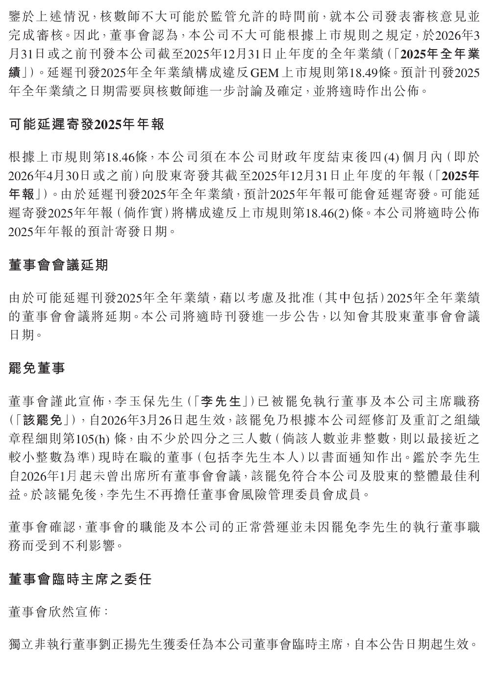因董事会主席李玉保涉嫌犯罪正接受中国公 安 局调查,导致无法获取充分适当的审计证据,预计2025年全年业绩将延迟刊发,可能在2026年3月31日之前无法完成审计。由于这一延迟,2025年年报的寄发也可能受到影响,预计将构成违反GEM上市规则第18.49条及第18.46(2)条。