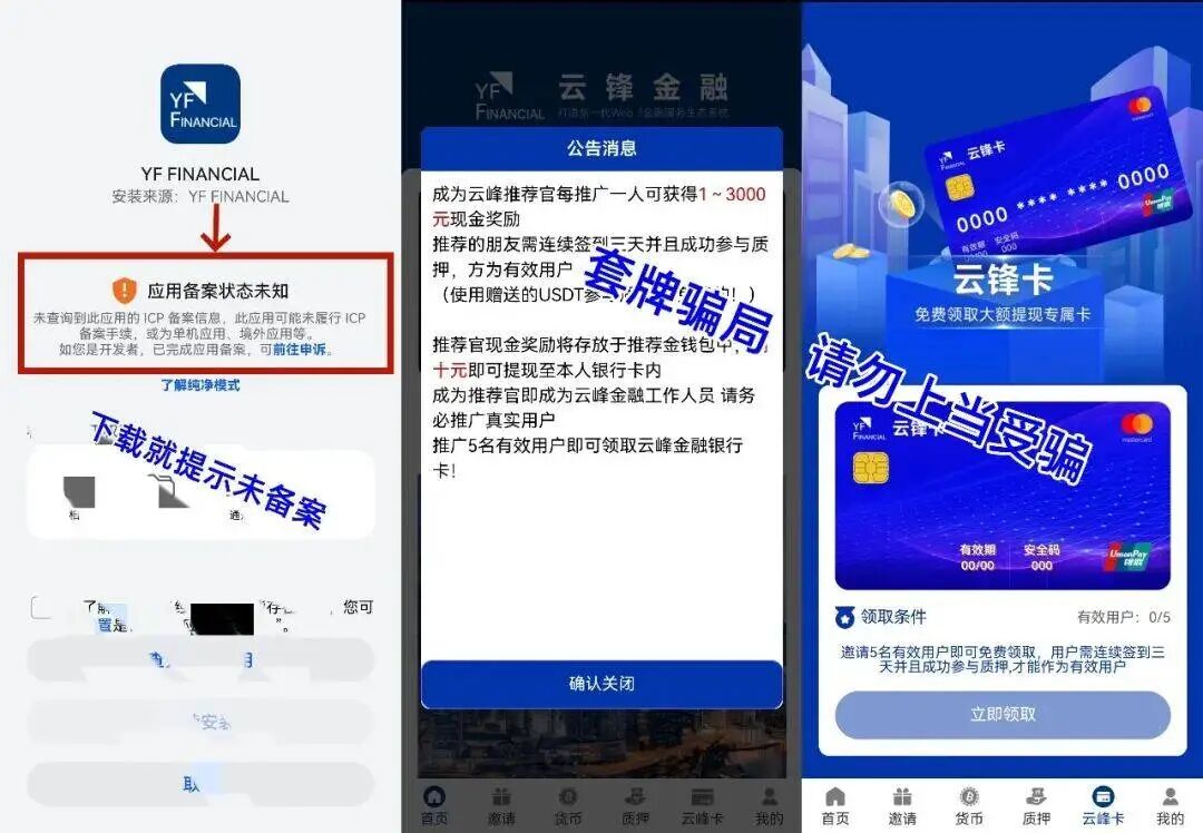 打着国家政策、乡村振兴、实体产业的旗号,谎称与国企、知名企业合作,伪造各种“高大上”背书;APP从不上架正规应用商店,仅通过私下二维码、链接传播,刻意规避监管;跑路前还会发布虚假整改、系统升级公告,拖延时间安抚投资者。