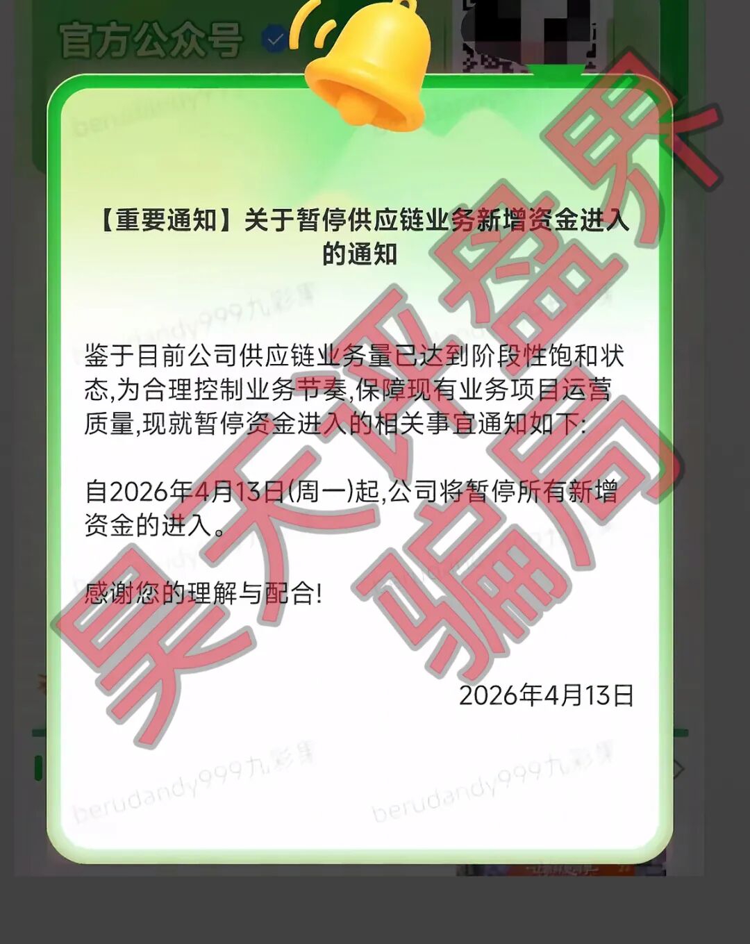 水果拼车骗局,之前昊天也是多次预警,昨日平台发布了公告:暂停新增资金进入,声称目前公司供应链业务量已达到阶段性饱和状态,为合理控制业务节奏,保障现有业务项目运营质量,现就暂停资金进入的相关事宜,相当于软跑路了,还在做同模式的可以撤了,大盘崩盘后会导致一些小盘受影响…