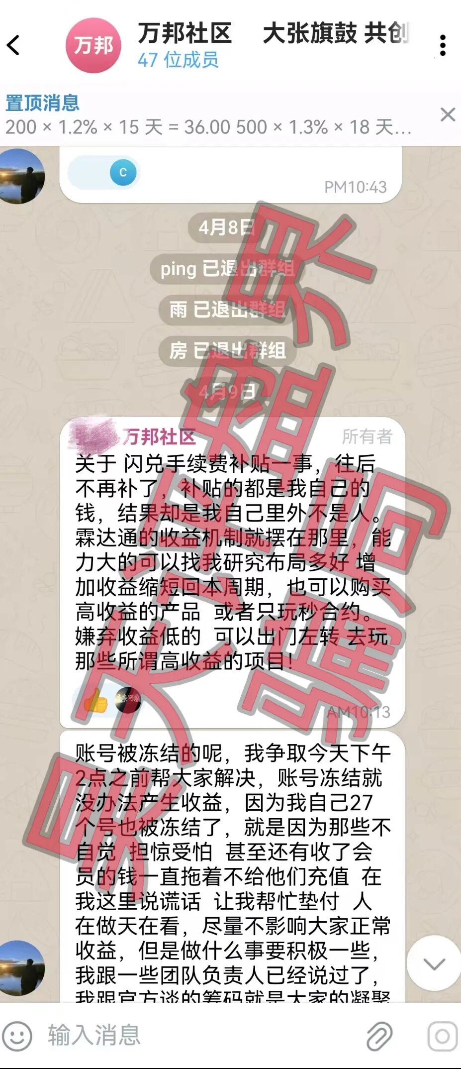 操盘手刘德伟是一直在单割会员,昨天凌晨受害者发现账号就登录不上了,交易所提现的也没有到账,把很多大团队都割了,包括聚运团队,聚鑫团队,金汇团队,顶汇团队,星光团队等等10多个团队,每个团队都有300~600人,合计总人数有2000~3000,此盘之前昊天也曝光过,据受害者反馈不少人已经选择报警,此盘已经被调查中,也没剩下什么人了,半死不活的,基本算是崩盘了…