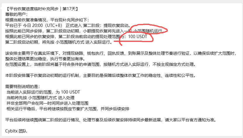 这几天说开始恢复提现,但是却只有100u的额度,而且还是随机的,不一定谁能提出来。