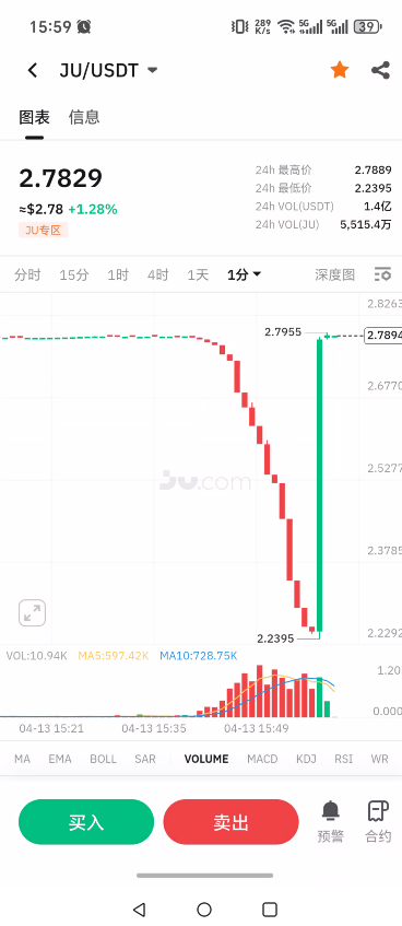 4月13日下午15:55,JU币毫无征兆瞬间砸盘,从2.7889U直接砸到2.2395U,随后又将币价拉起,币价拉起后,不少人发现自己无法提现了。