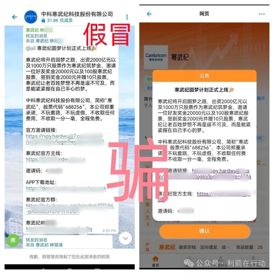 4月12日,网络中上线了假冒中科寒武纪科技股份有限公司的“寒武纪”APP,该项目宣传“实名认证注册就给100万元,邀请1位好友注册就给2万元,送100股寒武纪股票,每天签到给2000元,赠送10只股票……….”,有这种好事情?查到“寒武纪”APP的网站域名到今天才↓天,不是中科寒武纪科技股份有限公司的网站域名,系假冒!