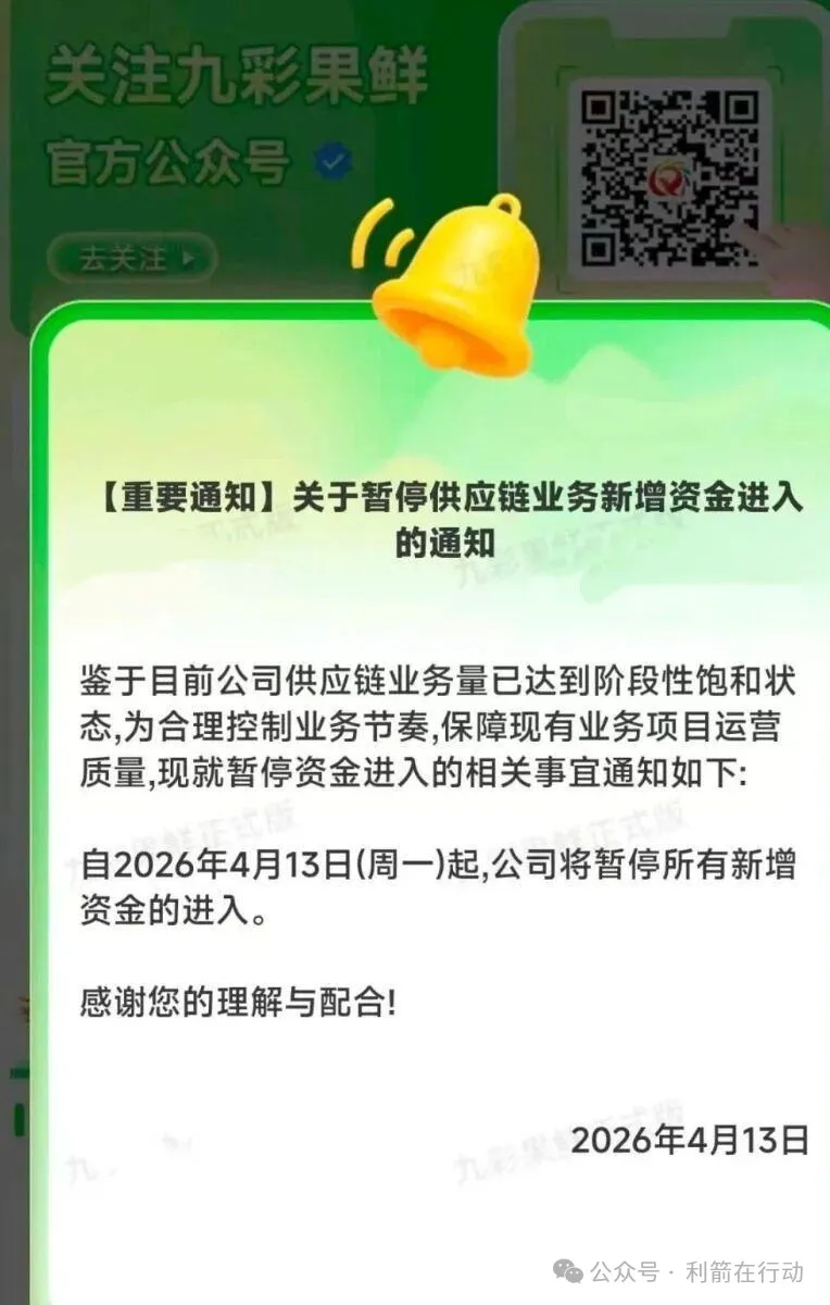 4月13日以“生鲜电商、水果认购、拼团返利”宣传的九彩果鲜发出了“关于暂停供应链新增资金进入的通知”,通知中“鉴于目前公司供应链业务量已达到阶段性饱和状态,为合理控制业务节奏,保障业务项目运营质量,现就暂停资金进入的相关事宜通知如下:自2026年4月13日(周一)起,公司将暂停所有新增资金的进入……..”