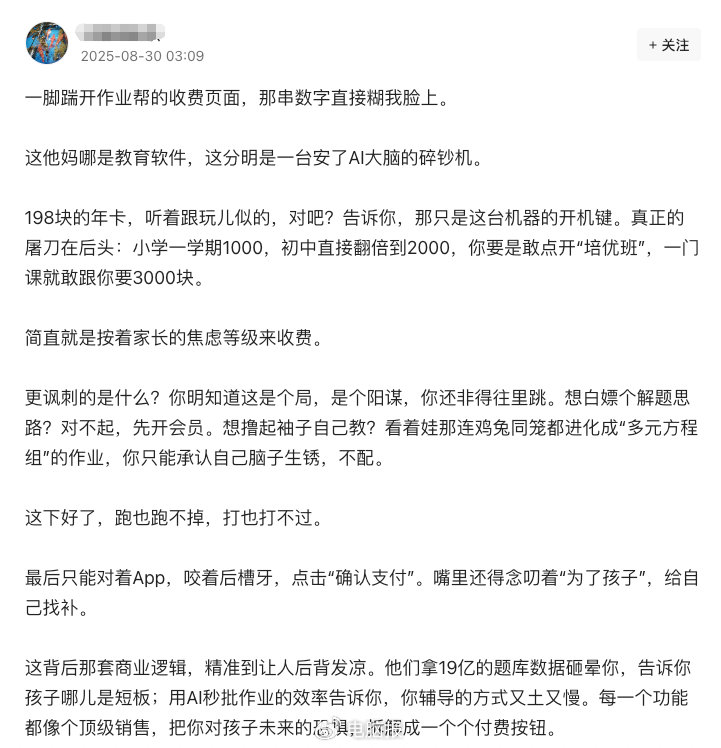 正如网友总结的,作业帮的学习机和App,都是利用家长和学生的教育焦虑,无论你是否购买服务,他们都会用各种营销手段让你花更多的钱,利用家长“为了孩子”的心理,最终有不少家长只能妥协,买越来越多的课。