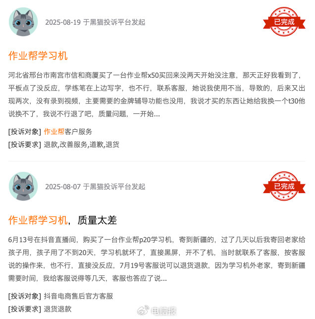 在众多被投诉品牌中,作业帮学习机成为焦点。无论是媒体报道还是社交平台的分享,其中有大量用户在购买作业帮学习机后,都会频繁接到客服的电话,要求购买教培课程,这也成为作业帮学习机最大的槽点。真有那么严重?为了探寻其中真相,我们开始了对作业帮学习机的深度调查。