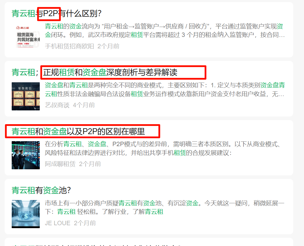 震哥最开始了解青云租还是从网上刷到的,经常看到青云租做的广告推广,标题都是青云租是不是资金盘,与资金盘有什么不同之类的。震哥当时就心想,青云租如果真的不是资金盘,天天在这跟资金盘对比啥呢?在搞什么暧昧?这不是此地无银三百两吗?你们有见过任何一家正规公司这样做广告吗?还有同类的正规租机平台,他们做的广告有跟资金盘去对比吗?好好想想吧
